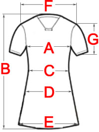 Velikost Prsa (A) Délka (B) Pas (C) Boky (D) Lem (E) Ramena (F) Rukávy (G)